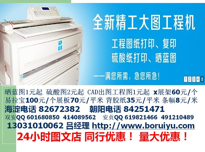 本公司是以標書裝訂、大圖復印、CAD出圖、工程圖復印、寫真噴繪、彩色輸出、加急快印名片、精裝、膠裝、數碼快印為主要業務的快印公司。彩色打印A4單面0.6元起黑白0.10元,名片10元起。